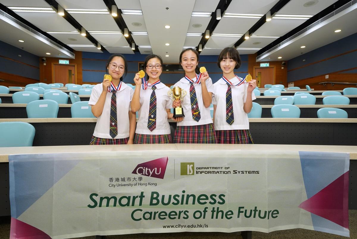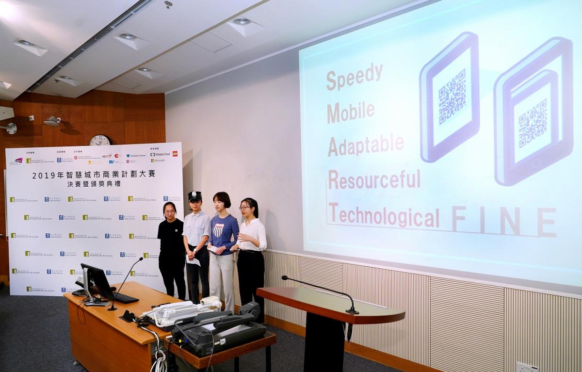 Enriched IT Class S5 students Madeline Leung and Moreen Ho and Business Studies S5 students Popo Fung and Summa Wong of St. Paul’s Convent School were crowned Champion and won the Best Creativity Award in the “2019 Smart City Business Plan Competition” with their winning proposal “Smart Fine”.