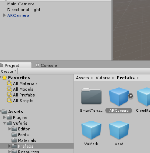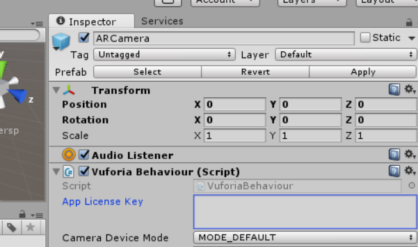 6. At lower left corner Asset -> Prefabs-> ARCamera drag to the left, press ARCamera (left), and copy the License Key of Step 3 to the App License Key in this Inspector.