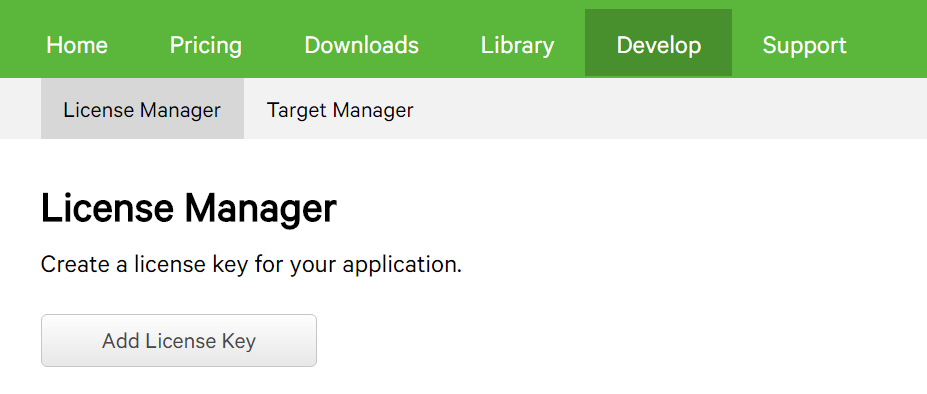 2. Go to https://developer.vuforia.com/ to create an account. After create an account, go to Develop-> License Manager -> Add License Manager (as showed in the picture below)