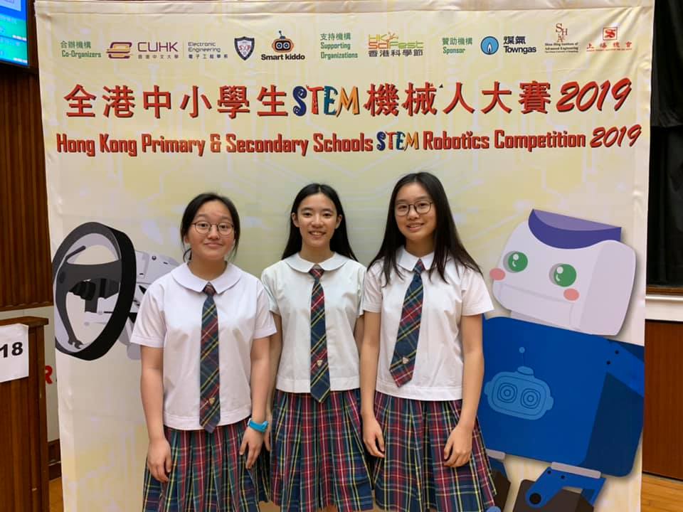 「中學資訊科技增潤計劃」伙伴學校聖保祿學校資訊科技增潤班同學中三級陳樂晴、陳皓欣及黎亦津在「全港中小學生STEM機械人大賽2019」獲得初中組冠軍。