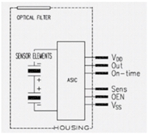 PIR上的 Optical Filter 会过滤波长 7-14um外的红外线 ( 人体的体温所产生波长约 10um的红外线 ) 。没有人移动时 , P1R 内的两组感应器元件的电压平衡 ; 当有人移动 , 一组感应器元件会接收人体红外线并产生电荷 , 破坏平衡电压 , 使电压输出。 - 门磁感应器